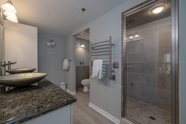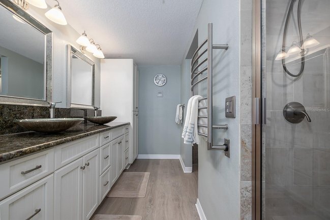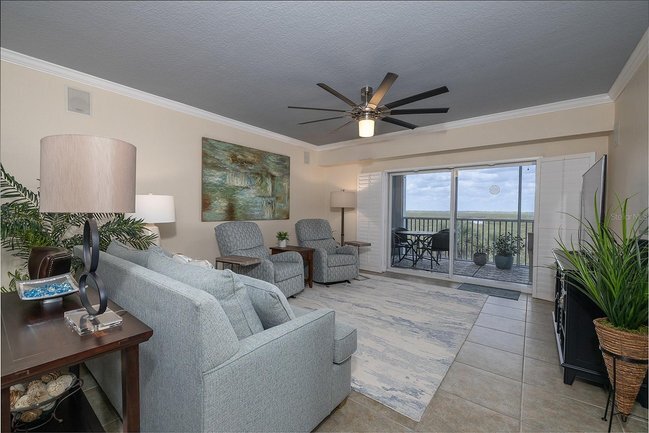 This beautifully updated immaculate 3 bedroom, 2 bathroom Furnished condo offers luxurious Coastal Living. Highlights include Custom Lighting, Plantation Shutters, and High-End Finishes throughout. Both bathrooms have been elegantly redesigned with meticulous attention to detail. The Primary Bath features a Steam Shower, Bidet, and Heated Towel Rack for a Spa-Like experience. Enjoy the oversized Screened-In Porch with built-in Sunshades, Double Fans, and stunning 365-day Sunset Views over the Estuary. Sip your morning coffee while watching Wildlife, and unwind in the evening with Wine and breathtaking Sunsets toward the West. This nearly Turn-Key unit comes with other thoughtful Touches throughout, including Custom Closet Organizers for efficient Storage, and elegant Under-Cabinet Lighting that adds a warm Ambiance to the space. The condo boasts Stainless Steel Appliances, Ceramic Tile throughout (including the patio), New A/C (2024), and New Water Heater. An OVERSIZED Personal Storage Unit next to the unit, Storage Cage in garage below building and close proximity to the Pool, Spa, and Gym add to its appeal. Just steps from a small, friendly beach and a quick ride to our vibrant local Arts Scene, you'll find two Farmers' Markets, Flagler Avenue's Restaurants, Watering Holes, and Boutiques, plus the charming Canal Street Business District—where the Locals dine, shop, and play. NEVER rented and Move-In Ready, this unit offers the best of Beach Living and Community Life. Be sure to check out our video tour and call your LOCAL realtor now to schedule a showing.